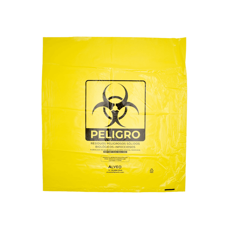 Bolsa de polietileno de baja densidad, libre de metales pesados para la recolección de residuos biológico infecciosos. Carga Máxima: 18 kg. Impresa a una tinta con logotipo de biológico infeccioso. Con fuelles. Calibre 300. Medidas: Ancho: 50.0 cm. Alto: 65.0 cm. Color: Amarillo. Pedido mínimo 5,000 piezas.