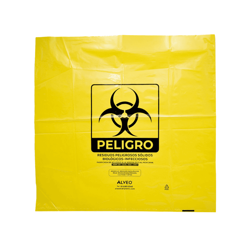 Bolsa de polietileno de baja densidad, libre de metales pesados para la recolección de residuos biológico infecciosos. Carga Máxima: 16 kg. Impresa a una tinta con logotipo de biológico infeccioso. Con fuelles. Calibre 300. Medidas: Ancho: 60.0 cm. Alto: 60.0 cm. Color: Amarillo.