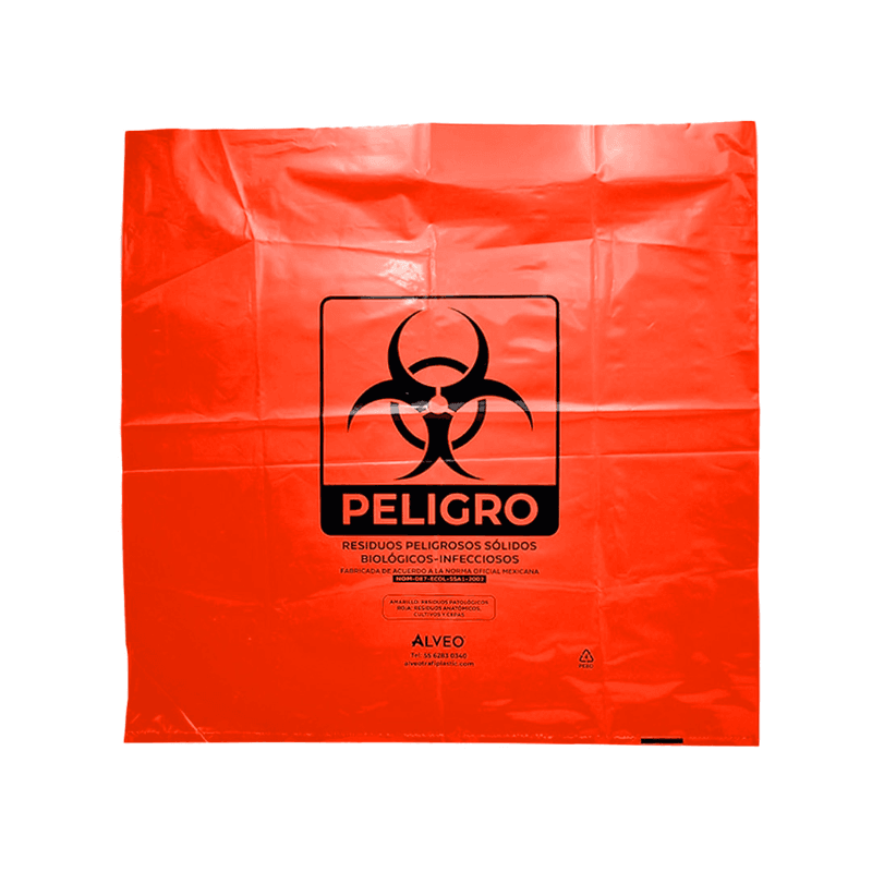 Bolsa de polietileno de baja densidad, libre de metales pesados para la recolección de residuos biológico infecciosos. Carga Máxima: 16 kg. Impresa a una tinta con logotipo de biológico infeccioso. Con fuelles. Calibre 300. Medidas: Ancho: 60.0 cm. Alto: 60.0 cm. Color: Rojo.